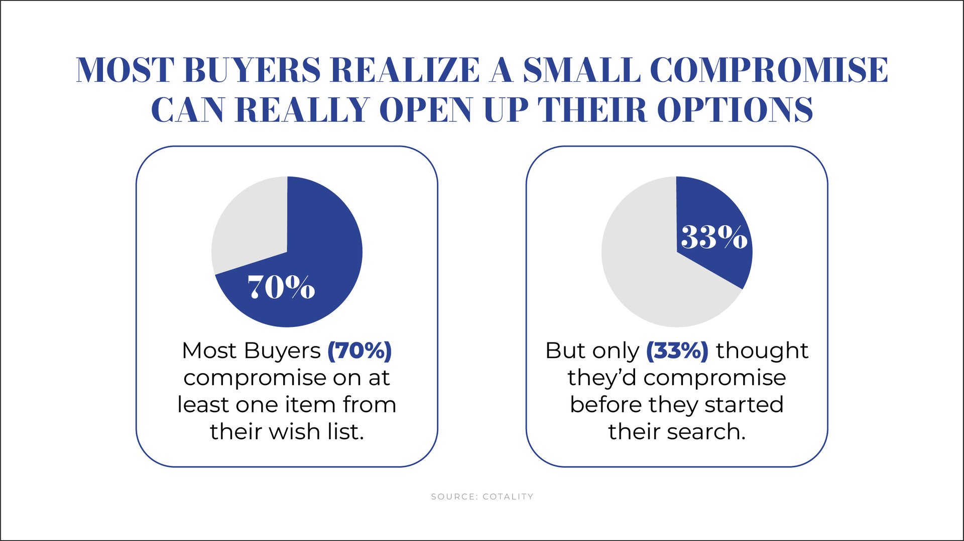 The data shows more buyers are using that strategy to offset affordability hurdles in today’s market. A recent study from Cotality found most buyers (70%) ended up compromising on one or more items from their original wish list. But before they started searching, only 33% expected to compromise at all: