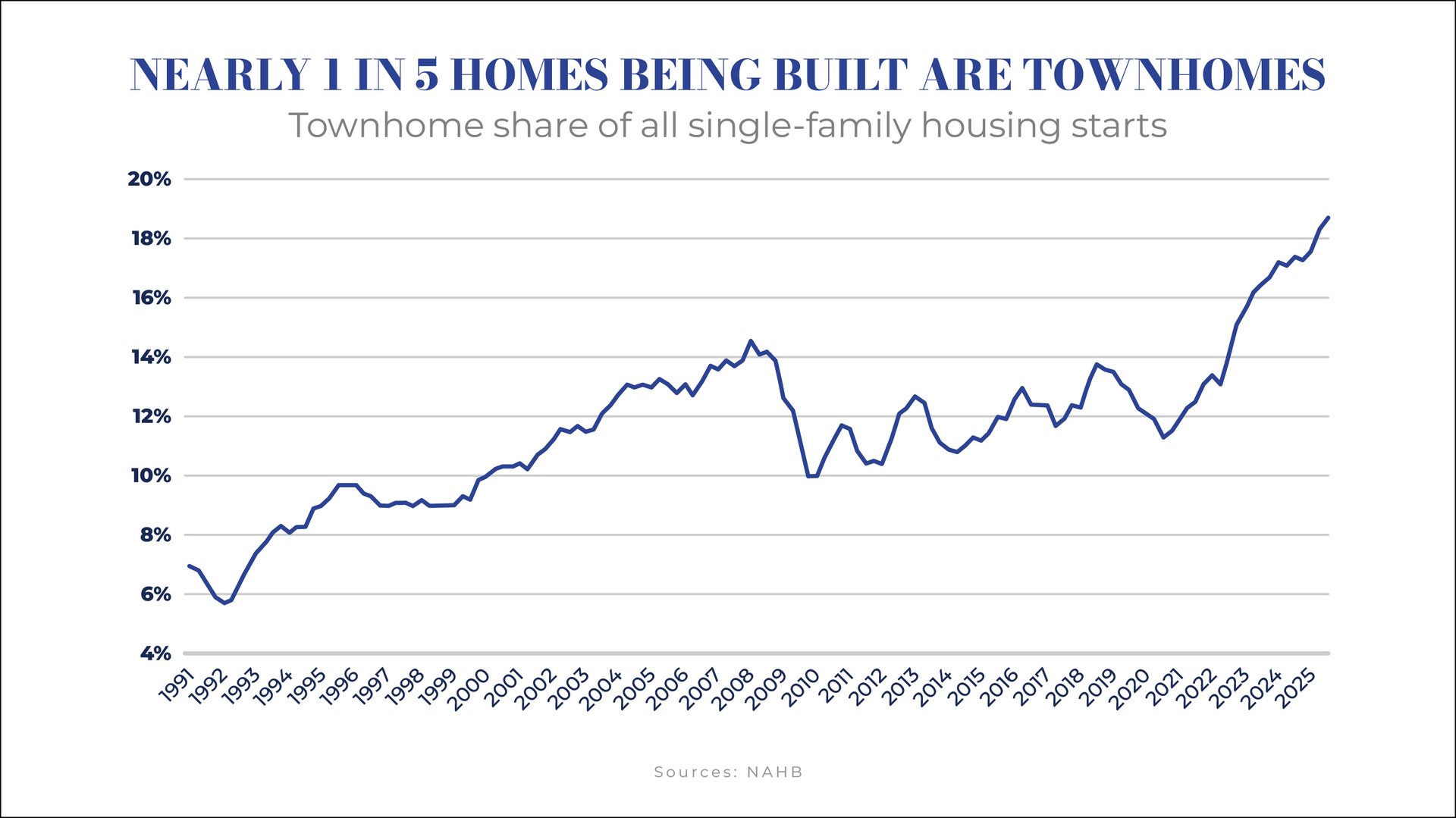 To put that in perspective, just a decade ago, townhomes made up closer to 1 in 10 new construction homes.